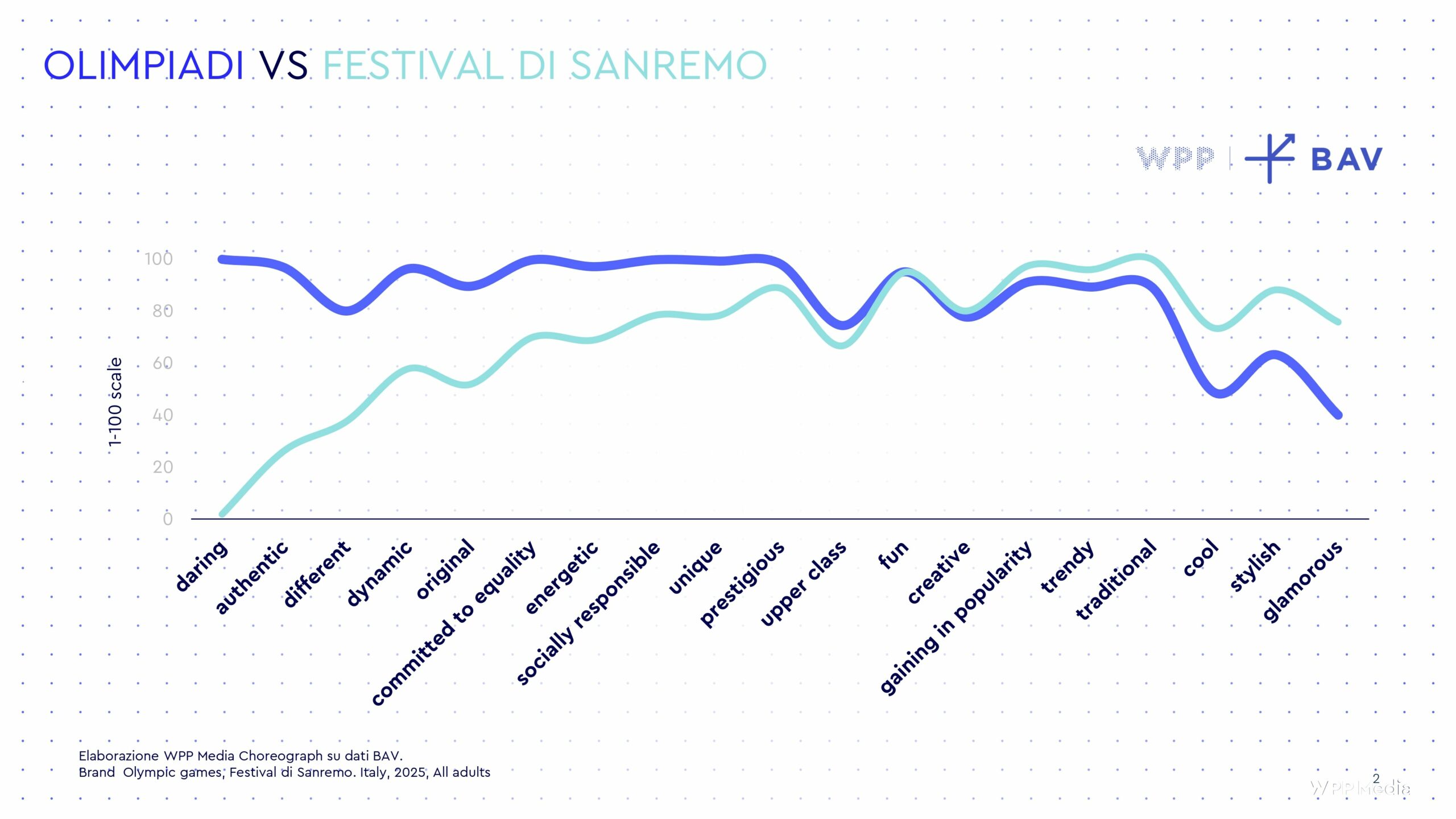 Inoltre, Festival e Olimpiadi, secondo l’analisi Brand Asset Valuator (BAV) di WPP – la più ampia piattaforma di brand analytics al mondo -, sono essi stessi marchi e per questo, sostiene WPP Media, si qualificano come eccezionali piattaforme di comunicazione per le aziende che scelgono di associarsi a essi. Ma con grandi differenze.