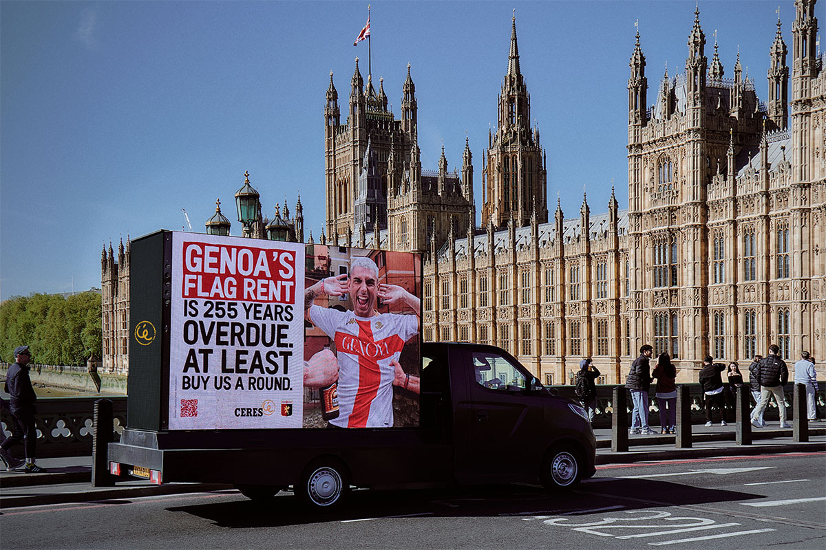 Il progetto si sviluppa oltremanica con una campagna OOH nel cuore di Londra, durante la festa nazionale proprio per San Giorgio. Le affissioni, caratterizzate da headline come: “Genoa’s flag rent is 255 years overdue. At least buy us a round.” e “Genoa calling. London paying?”, trasformano Trafalgar Square, il palazzo di Westminster e altre location nel palcoscenico di un “gentle reminder” dal tono provocatorio ma leggero. A completare la domination, Ceres ha vestito alcuni tifosi di un Genoa Club locale con delle maglie speciali e il copy di campagna, trasformandoli in media itineranti.