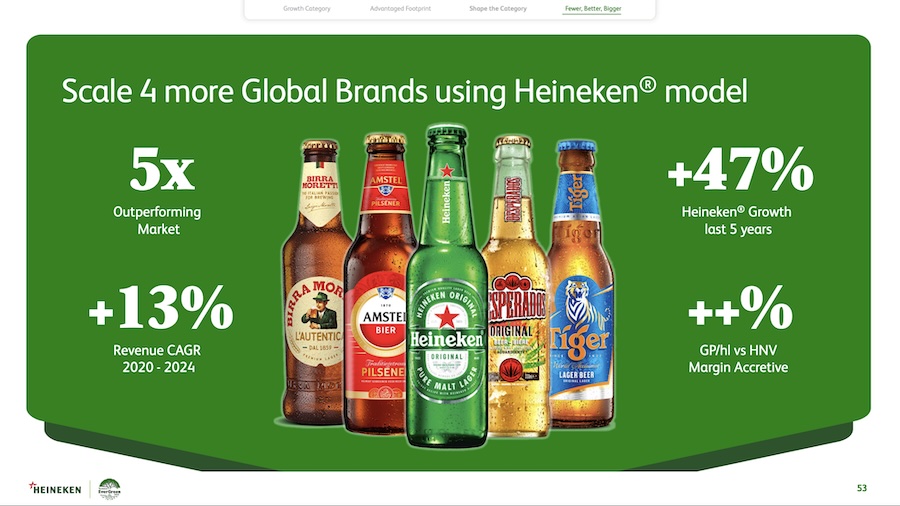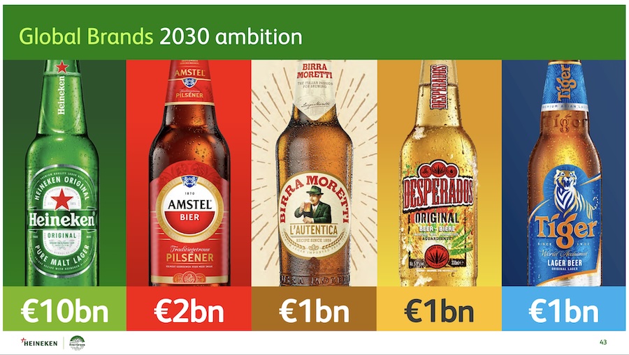 Scalare altri brand accanto ad Heineken. Tra i punti chiave della nuova strategia, c’è il progetto di scalare altre 4 marche chiave utilizzando lo stesso modello del masterbrand Heineken. Si tratta di brand forti e complementari come Birra Moretti, Amstel, Desperados – molto focalizzato sulla Gen Z – e Tiger che complessivamente hanno generato il 47% della crescita del gruppo negli ultimi cinque anni e le cui vendite superano di 5 volte la media del mercato.