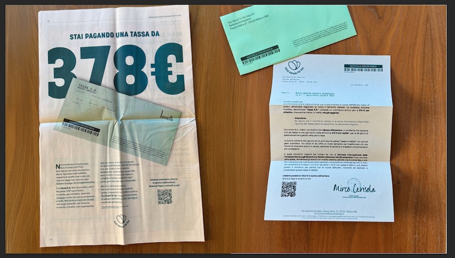 La Tassa SA. Per sensibilizzare gli italiani, per i quali il fenomeno dello spreco alimentare resta spesso invisibile, Auge ha ideato anche un’attività PR trasformando il valore del cibo che finisce nella spazzatura in una tassa – argomento che scatena sempre indignazione nel nostro paese – che ha preso forma in oltre 500 lettere dall’aspetto ufficiale: buste verdi, intestazioni formali, tono istituzionale.
