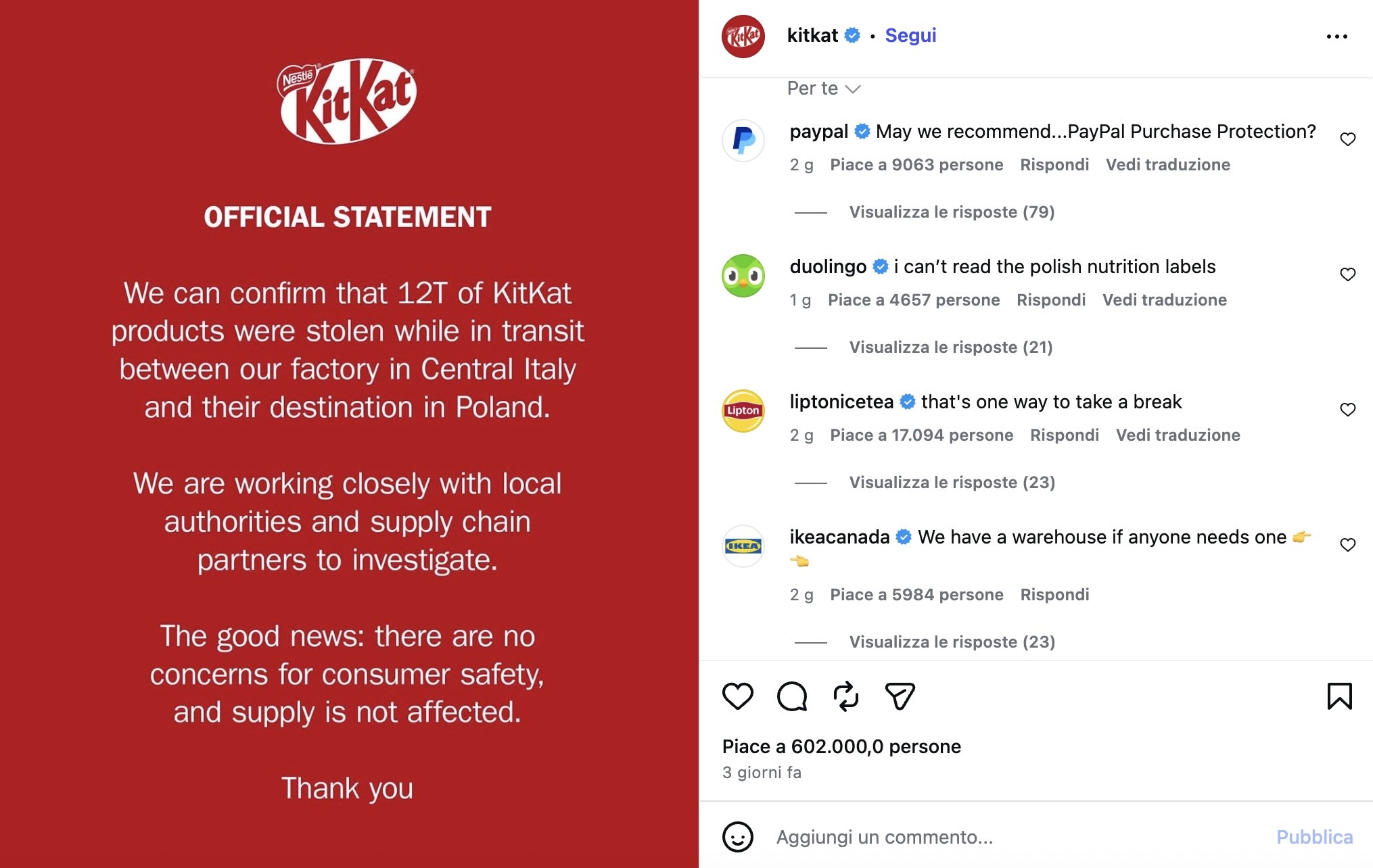 Già indicata come una delle migliori risposte a una situazioni di crisi, la storia delle 413.793 barrette KitKat rubate durante il tragitto dall’Italia centrale alla Polonia il 23 marzo scorso ha una nuova evoluzione.