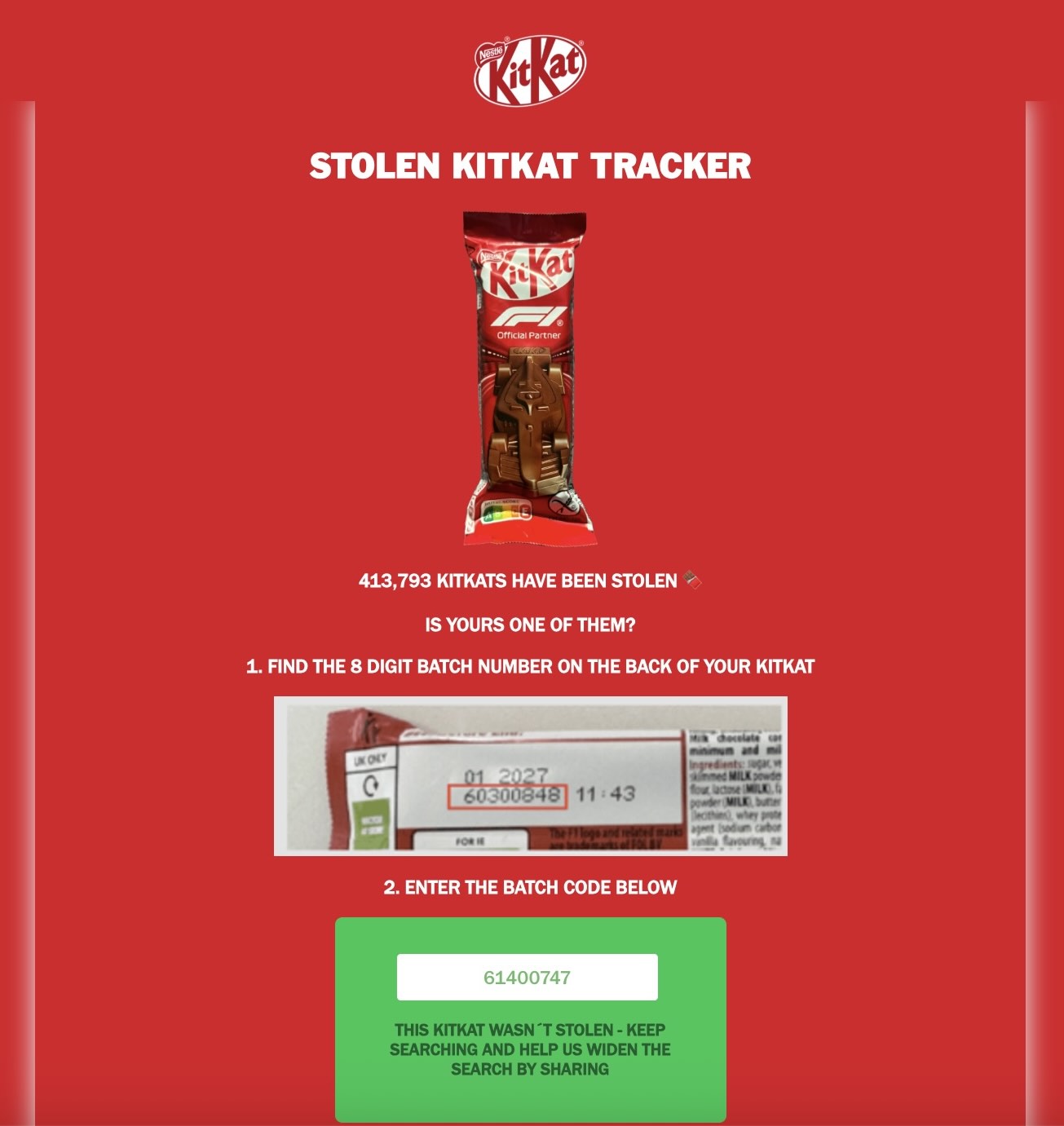 Chi vuole controllare le barrette acquistate – in negozi o canali non ufficiali – può andare sul sito web dedicato, inserire il codice del lotto stampato sulla confezione e verificare se la barretta di KitKat faccia parte del lotto rubato. Se i numeri inseriti non corrispondono, appare evidenziato in verde il messaggio ‘Questo KitKat non è stato rubato. Continua la ricerca e aiutaci ad allargarla condividendo’.