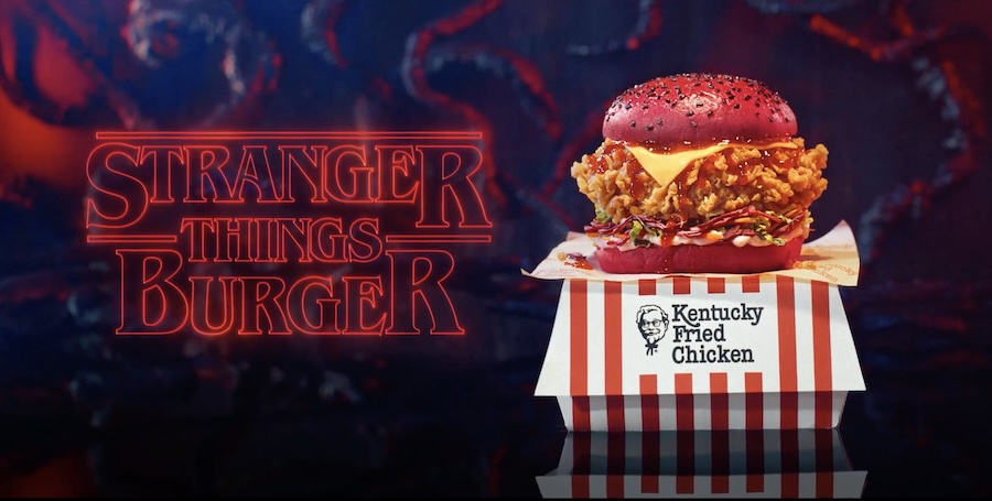 Lo Stranger Things Burger è caratterizzato da una salsa agrodolce e piccante, slaw croccante e un bun rosso, mentre le Stranger Wings rieditano le Hot Wings di KFC con la stessa salsa.