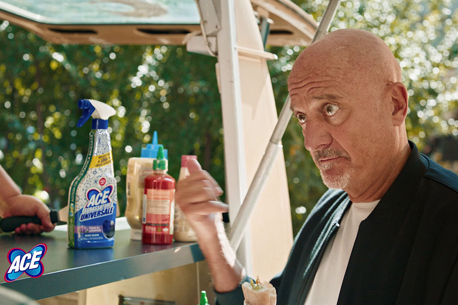 Protagonista questa volta è Ace Spray Sgrassatore Universale, raccontato con l’ironia del testimonial “imperfetto”.