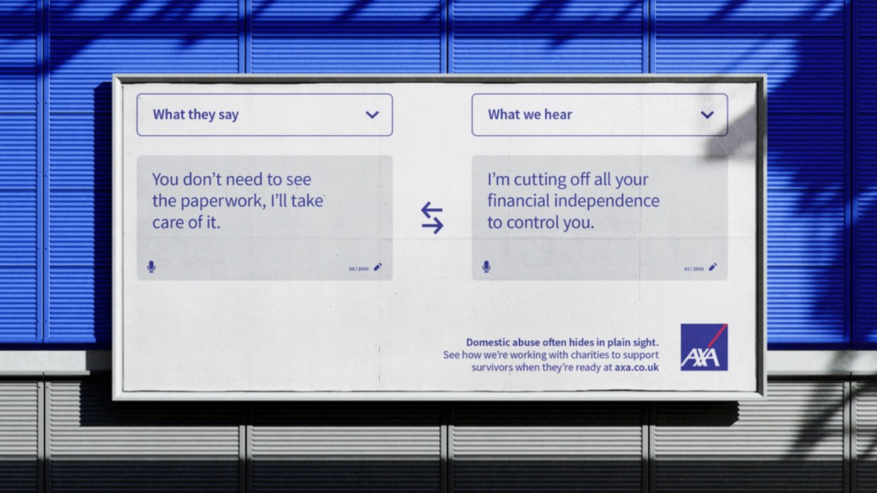 Sulla stessa linea, Axa UK ha lanciato la campagna “What they say. What we hear” che affronta la violenza domestica nel suo aspetto economico, docodificando un certo tipo di linguaggio che può essere un segnale poco visibile di abuso.