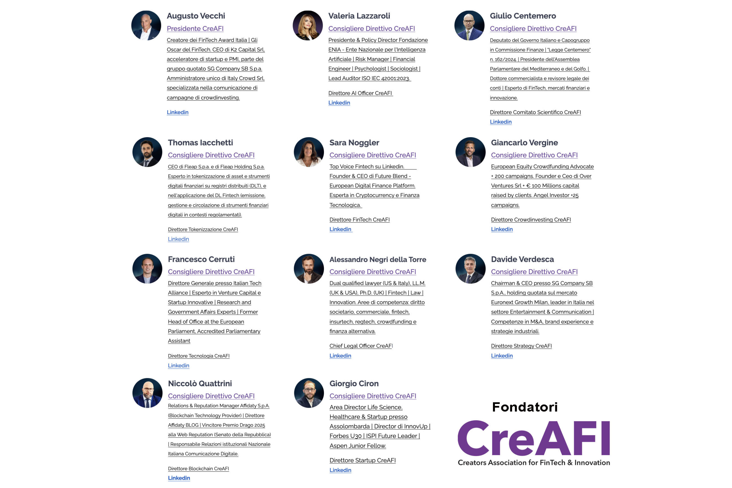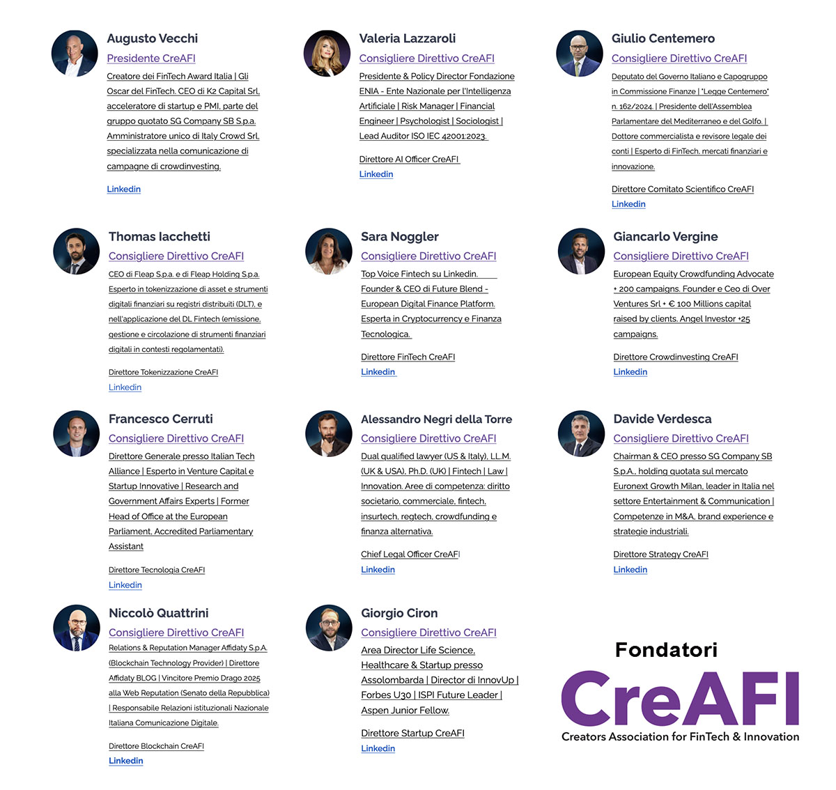 Con l’obiettivo di elevare il livello di professionalità, trasparenza e autorevolezza nel panorama dei creator e degli influencer operanti nei settori finanziario e dell’innovazione tecnologica è nata CreAFI – Creators Association for FinTech & Innovation, un’associazione senza scopo di lucro dedicata al monitoraggio, alla valorizzazione e riconoscimento dei finfluencer e dei business creator.