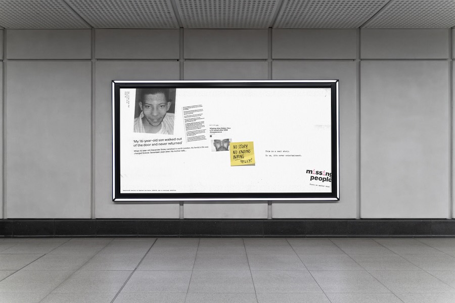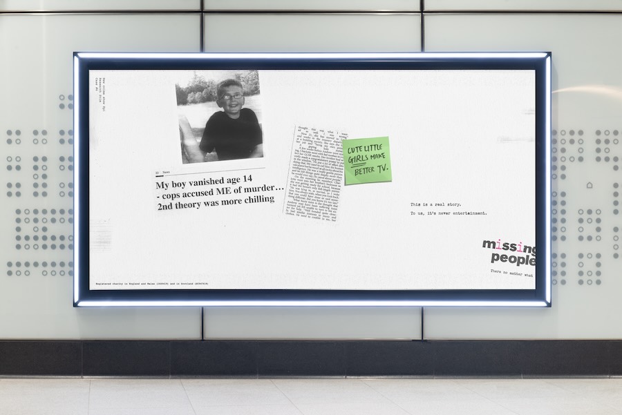 Il fulcro della campagna è un lungo video satirico e incisivo che affronta il disagio senza mezzi termini: ambientato in una sterile stanza a disposizione degli sceneggiatori mentre esaminano i casi potenziali per il prossimo programma televisivo e trattano vite umane come fossero personaggi di una storia, il racconto si ribalta facendo scoprire che ogni caso discusso è reale e che le famiglie meritano rispetto e sostegno. Poiché in Uk scompare una persona quasi ogni 90”, mentre il 49% del pubblico fruisce di true crime ogni giorno, Missing People lancia il Responsible Narrative Character a cui podcaster e sceneggiatori dovrebbero attenersi adattando le storie in modo che siano rispettose di chi scompare e delle famiglie che ne aspettano il ritorno.