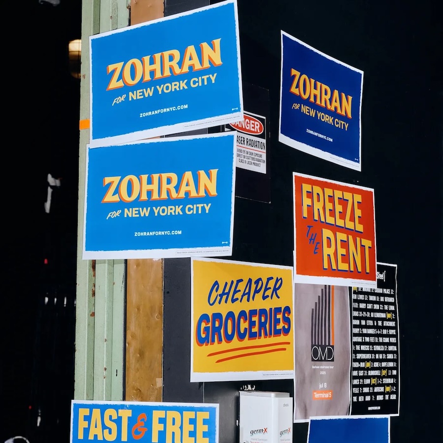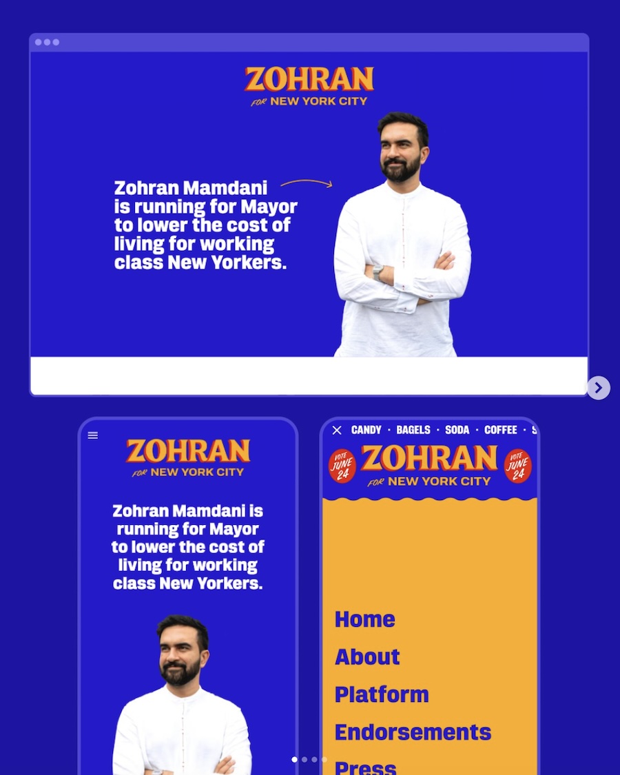 A trasmettere la carica di novità del candidato, e ora prossimo sindaco di New York, Zohran Mamdani hanno contribuito non poco il design e l’identità visiva della sua campagna. Giocata tutta sui toni vibranti del blu brillante, del giallo senape e del rosso, era distante anni luce da quelle tradizionali, sia di parte democratica che di parte repubblicana, caratterizzate da colori piatti, blu e rosso d’ordinanza, font senza grazie, foto-santino praticamente indistinguibili. Se invece togliessimo il nome e il viso di Mamdani, quell’identità visiva li richiamerebbe istantaneamente.