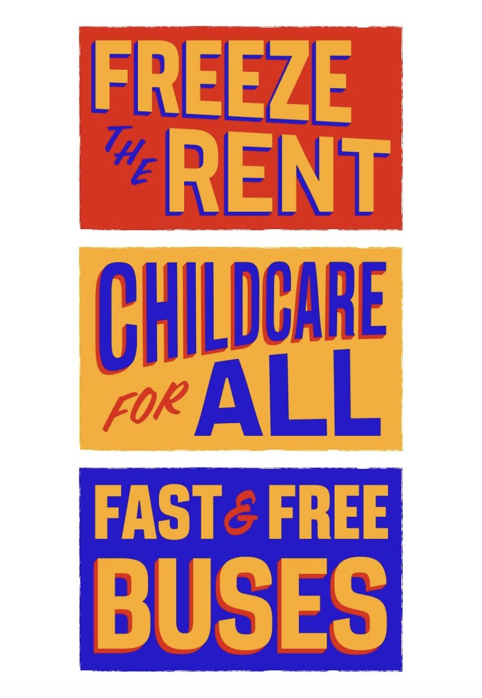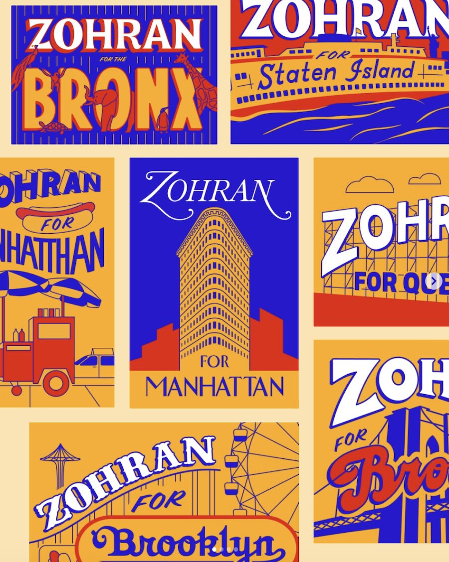 Si tratta, dice in un reel su Instagram, di una campagna politica che punta su un brand e un’identità visiva flessibile e immediatamente riconoscibile. I colori vivaci e caldi – ispirati ai taxi gialli, alla Metro Card, ai colori delle squadre simbolo di NY come i Mets, i Knicks, gli Islanders – danno un tocco umanistico per cui i messaggi come “Blocca l’affitto” o “Autobus veloci e gratuiti” emergono semplici, chiari ed efficaci senza risultare corporate.