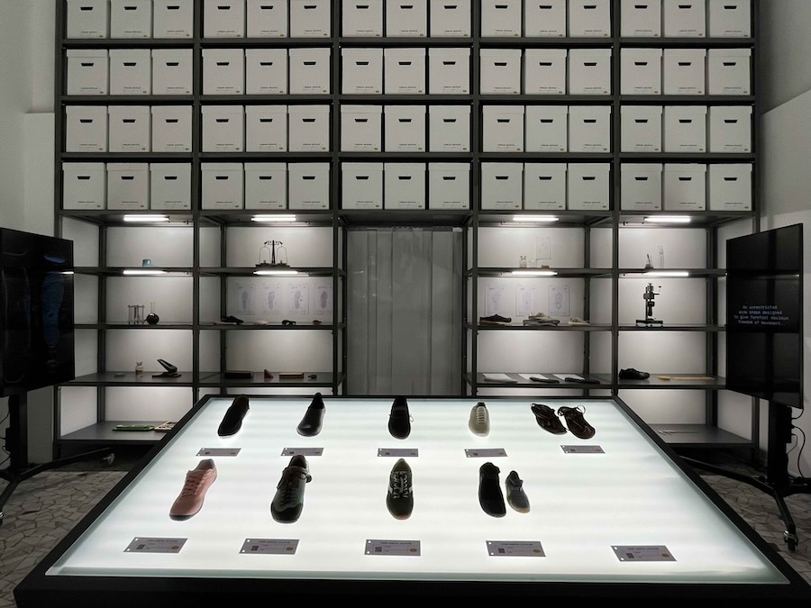 Cuore dell’allestimento è l’Archive Wall, struttura metallica che funge sia da libreria di oggetti di scena, sia da superficie espositiva per i prodotti delle cui suole mostra ogni dettaglio estetico e di performance.