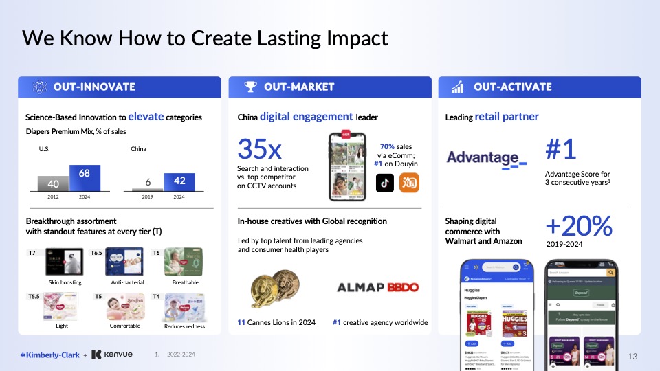 Dieci i brand con vendite per almeno un miliardo di dollari sui quali potrà contare, come Deepend, Poise, Huggies, PullUps, Cottonelle, Kleenex, Kotex da parte di Kimberly-Clark, e Tylenol, Zyrtec, Neutrogena, Aveeno, Listerine, BandAid e Neosporin da parte di Kenvue. «Kenvue è posizionata in modo unico all’intersezione tra CPG e assistenza sanitaria, con talenti eccezionali e un’offerta di brand differenziata che serve categorie interessanti della salute dei consumatori» ha detto Mike Hsu, presidente e ceo di Kimberly-Clark.