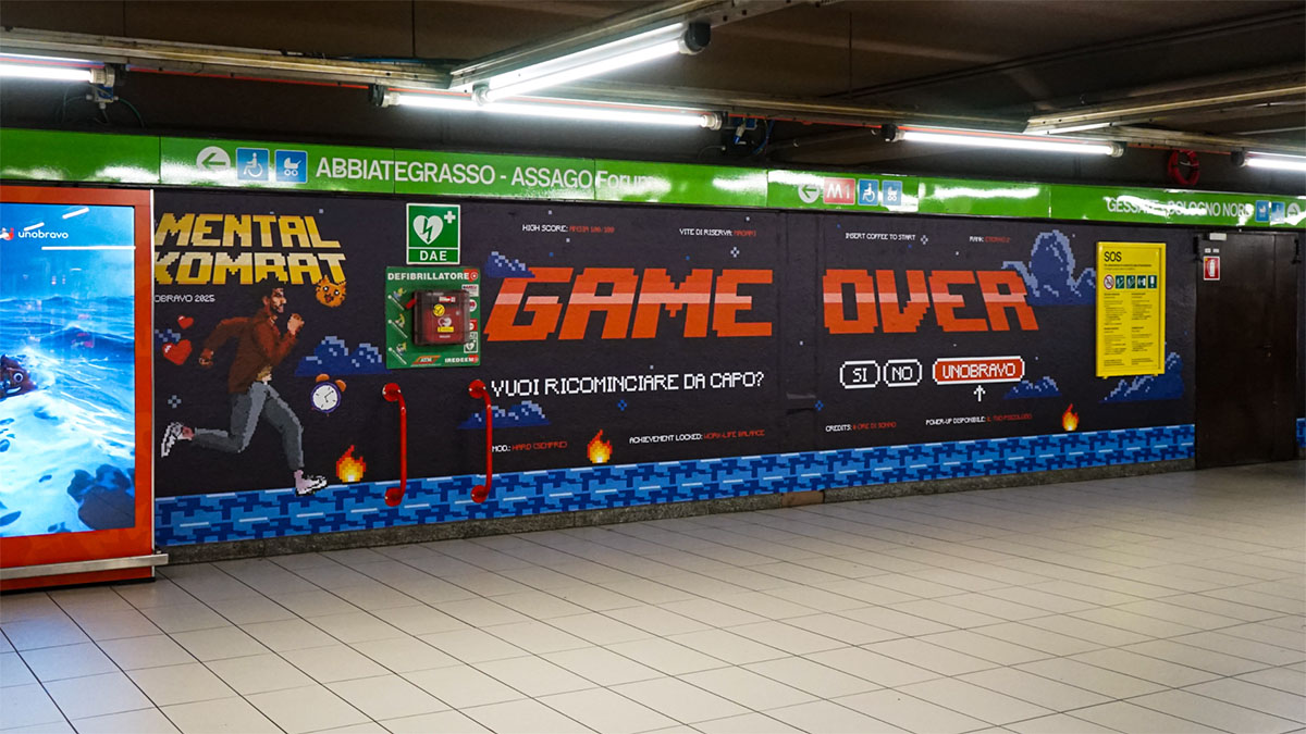 La station domination di Cadorna reinterpreta questi due universi in un’esperienza fisica e immersiva, portando il racconto fuori dallo schermo e dentro la realtà. A collegare i due mondi, un corridoio centrale tappezzato di pensieri e frasi comuni dà voce al caos mentale quotidiano. Le piattaforme arancioni invitano i passanti a “saltare” tra una e l’altra, evitando simbolicamente le follie di ogni giorno fino ad approdare a Unobravo: uno spazio sicuro di ascolto e consapevolezza.