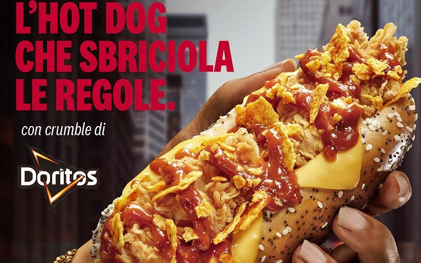 La ricetta segna la collaborazione tra KFC e Doritos: il nuovo hot dog è infatti ricoperto da un crumble di Doritos.
