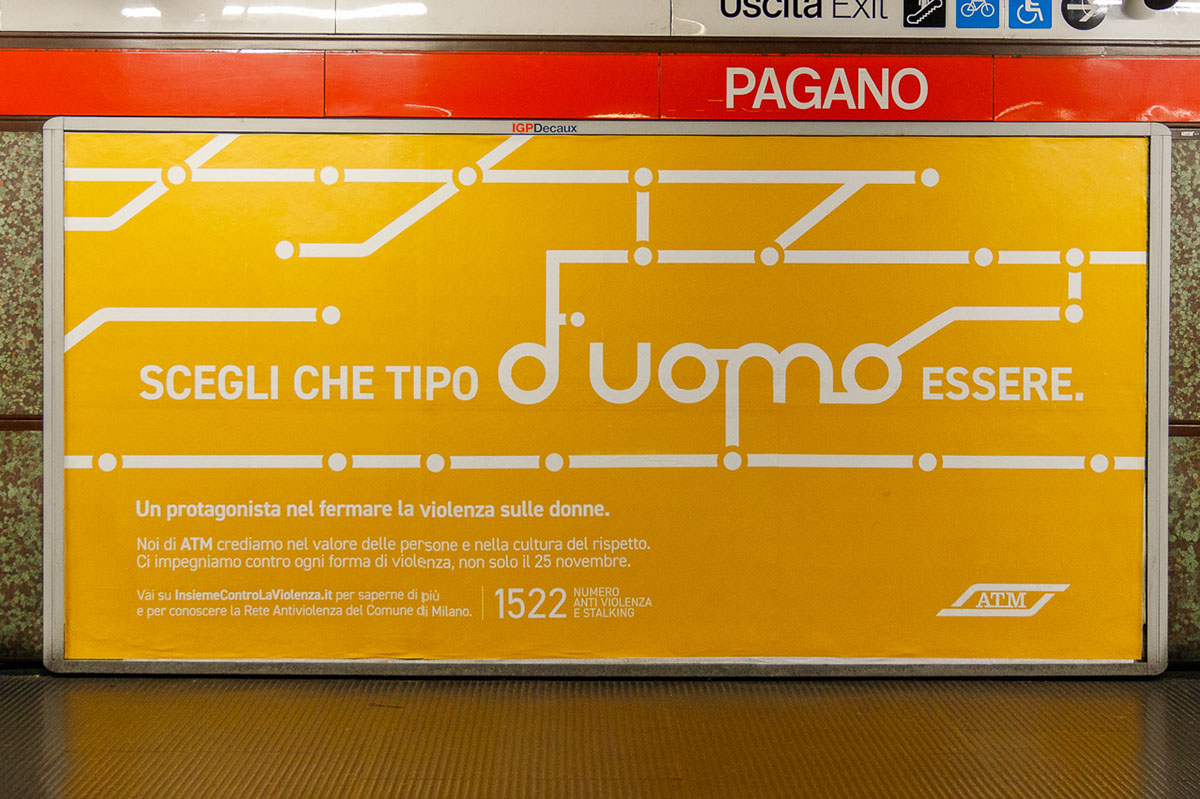 L’idea creativa di Yam112003 per ATM utilizza i nomi di alcune fermate della metropolitana e con un gioco di parole realizza messaggi diretti e di impatto: “Contro la violenza sulle donne gli uomini hanno un ruolo Centrale”, “Scegli che tipo D’uomo essere”, “Isola chi fa violenza, non chi la subisce”, “Lotto contro la violenza sulle donne”.