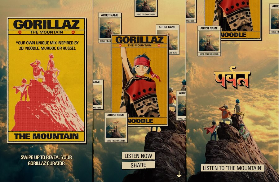 Disponibile per gli ascoltatori della band in UK, Stati Uniti, Canada, Australia, Nuova Nuova Zelanda, Messico, Brasile, Italia, Polonia e Spagna, in base alla cronologia di ascolto personale l’esperienza abbinerà l’utente a uno dei quattro personaggi: 2D, Noodle, Russel o Murdoc. Una volta trovato il proprio alter ego, si può sbloccare una playlist personalizzata con i brani di The Mountain insieme ai classici preferiti della band, selezionati appositamente, e delle schede con le illustrazioni del co-creatore dei Gorillaz, il fumettista Jamie Hewlett, da condividere sui social media.