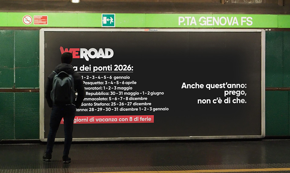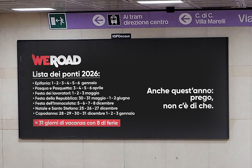 «La campagna Ponti è diventata una firma di WeRoad: un’idea semplice, riconoscibile e utile. È esattamente il tipo di comunicazione che ci rappresenta. Quando vediamo le foto nelle stories e nei gruppi WhatsApp capiamo che è diventata un servizio alla community, non solo una pubblicità» commenta Giulia Flamà, marketing manager di WeRoad.Con oltre 400 affissioni in metropolitana sul circuito IGPDecaux, la campagna Ponti 2026 consolida un’idea che è ormai una firma del brand perché confermando la capacità di tenere insieme creatività, risultati e semplicità di esecuzione: un insight chiaro (l’ossessione tutta italiana per i ponti) trasformato in un oggetto visivo minimale e altamente condivisibile.