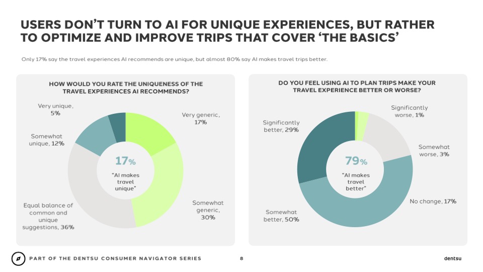 I viaggi tengono secondo il Travel Report di Dentsu ma, anche qui, si viaggia con maggiore selettività e con grande attenzione al valore ottenuto. Non si rinuncia al viaggio, ma cambia il modo in cui lo si pianifica, a partire dalle mete e stabilendo le proprie priorità: in questo aiuta l’AI, strumento usato come ottimizzatore piuttosto che come un creatore di sogni. Una persona su 4 ha usato l’AI per pianificare i propri viaggi, principalmente per fare ricerca sulle destinazioni, organizzare gli spostamenti e migliorare l’efficienza, meno invece per scoprire esperienze uniche.