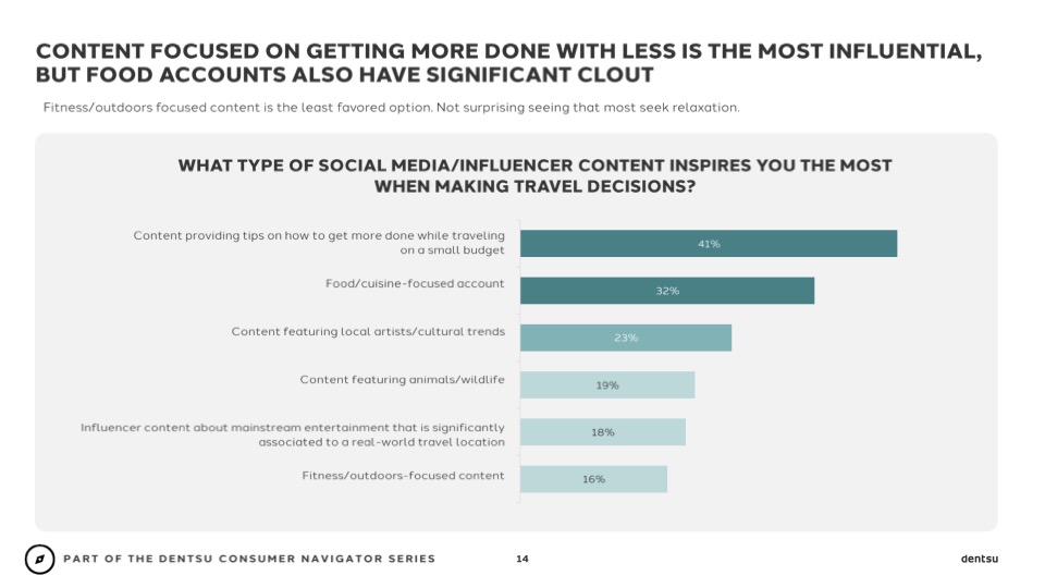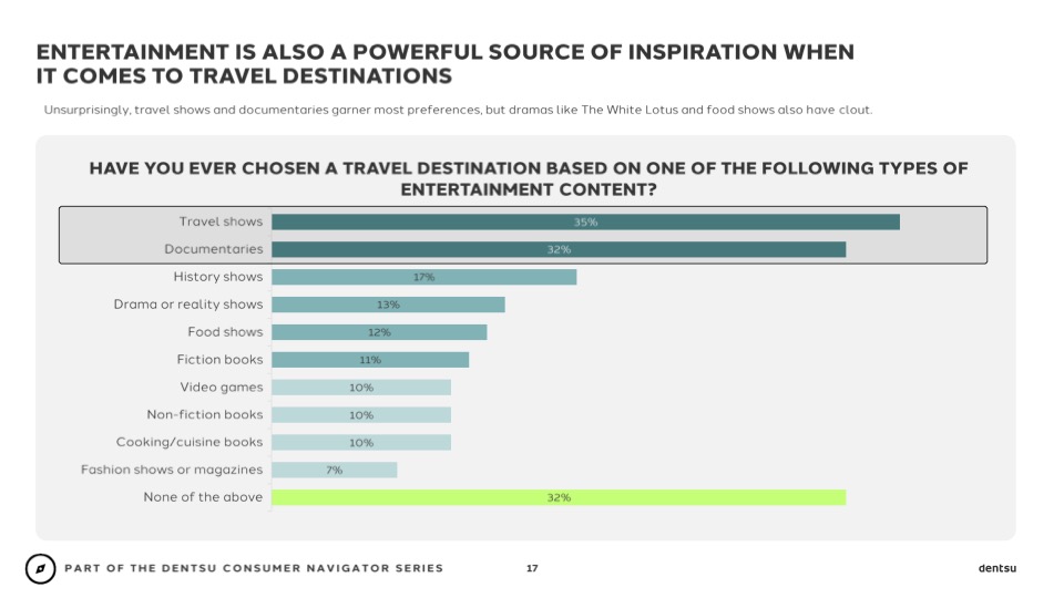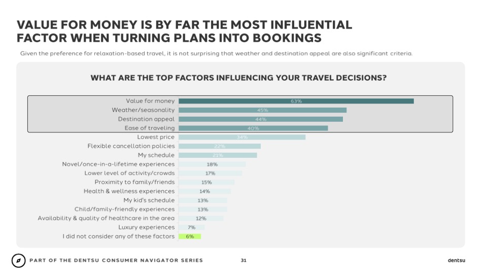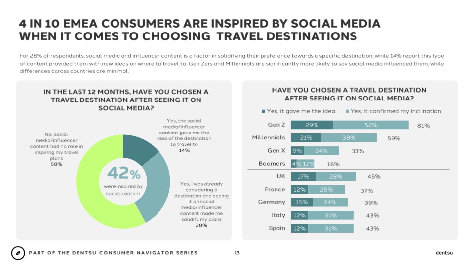 Tornando al quadro generale, Dentsu racconta come ovunque nell’area EMEA l’ispirazione sia sempre più plasmata dai media, con i social che influenzano la scelta della destinazione per il 42% dei consumatori, ma le decisioni restano ancorate alla praticità. I viaggi di piacere sono in media uno o due all’anno, con molti che optano per destinazioni accessibili e opzioni di fascia media o budget, e quasi la metà che dichiara di spendere meno per i viaggi quest’anno rispetto allo scorso. Il rapporto qualità-prezzo è il fattore principale nelle decisioni di viaggio, seguito dal meteo, dal fascino della destinazione e dalla facilità di spostamento.