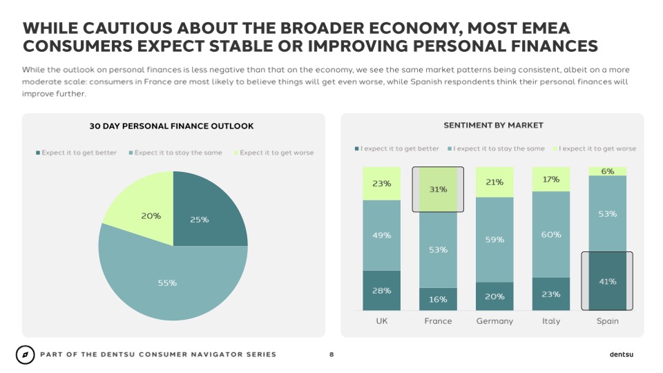 Il Mindset Report, che delinea il contesto generale del trimestre, evidenzia dunque la cautela generale dei cittadini, una scarsa fiducia verso l’economia nel suo complesso ma un certo grado di sicurezza sulle proprie finanze personali, oltre agli sforzi nel conseguire il miglior valore possibile nelle decisioni quotidiane. Il 51% afferma di essere stato in grado di affrontare tutte le spese necessarie negli ultimi 30 giorni, mentre l’80% si aspetta che le proprie finanze personali rimangano stabili o migliorino nel breve termine. La Spagna è il mercato più ottimista su tutti gli indicatori chiave, la Francia è il più negativo in termini di sentiment economico, prospettive e pressione finanziaria, mentre l’Italia registra il più alto livello di riduzione della spesa dichiarato.
