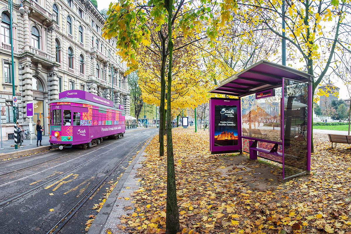 Un tram completamente personalizzato attraversa piazza Castello, Cairoli, Cadorna e via Boccaccio trasformando il tragitto urbano in una finestra sulle atmosfere e sui paesaggi dell’Arabia Saudita.