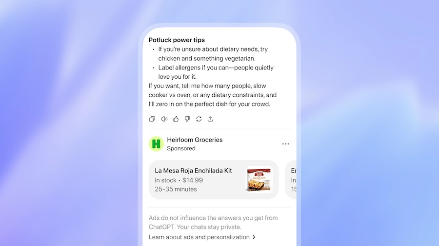 Come spiega l’azienda, gli annunci sono stati pensati per facilitare agli utenti un accesso più ampio a funzionalità più potenti di ChatGPT senza minare la fiducia necessaria quando si chiede supporto al chatbot per attività importanti e personali. Come spiegato qualche settimana fa nell’illustrare i principi con cui la pubblicità sarà erogata, gli annunci non influenzeranno le risposte fornite da ChatGPT e ogni annuncio sarà sempre chiaramente etichettato come sponsorizzato e separato visivamente dalla risposta organica.