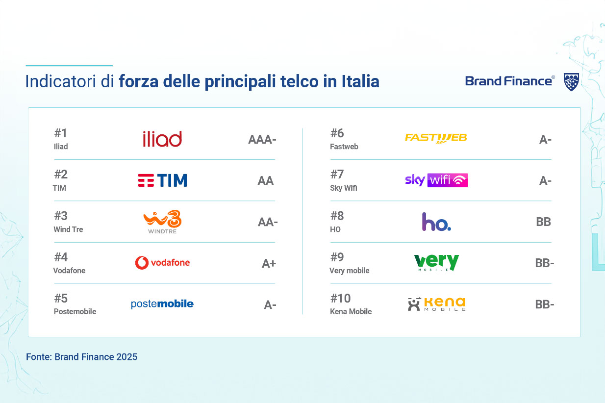 Secondo Brand Finance, Iliad è leader nella percezione del rapporto qualità-prezzo e nell’affidabilità; TIM, con brand rating molto forte (AA), secondo solo a Iliad, è quello percepito con la migliore copertura e con il miglior servizio clienti; Vodafone (A+) è percepito come leader nel 5G; Sky WiFi (A-) è considerato il brand più innovativo, mentre Postemobile (A-) è quello più attento alla sostenibilità.