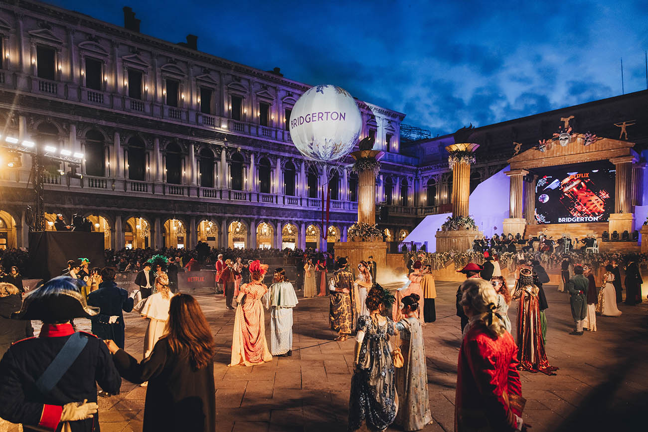 Sabato, primo giorno dell’evento, Netflix ha messo in scena una rappresentazione della storia d’amore di Sophie e Benedict tramite una romantica performance aerea, offrendo inoltre ai fan un ballo aperto in cui celebrare il loro amore (il primo ballo “aperto al pubblico” mai realizzato al Carnevale di Venezia).