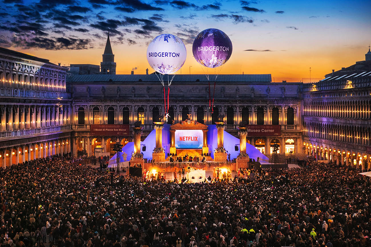 La strategia marketing di Netflix è guidata dall’ascolto e dal coinvolgimento diretto della community, spesso sfruttando riferimenti noti e rilevanti della cultura pop locale. Per il lancio in Italia della quarta stagione di Bridgerton, ha inaugurato il Carnevale di Venezia con una danza aerea in piazza San Marco e un “gran ballo” aperto a fan e creator selezionati. L’attività porta la firma delle agenzie We Are Social e Paride Vitale
