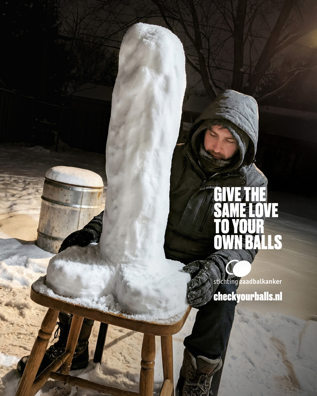 Il cancro ai testicoli è la forma di cancro più comune tra gli uomini tra i 15 e i 40 anni, con circa 800 nuove diagnosi all’anno nei Paesi Bassi, tuttavia, se la malattia viene diagnosticata precocemente, il tasso di guarigione raggiunge il 95%. Ma le barriere alla prevenzione sono ancora alte e per abbassarle l’agenzia ha raccolto un’idea vista per strada, osservando tante persone intente a creare non solo pupazzi, ma anche peni di neve.
