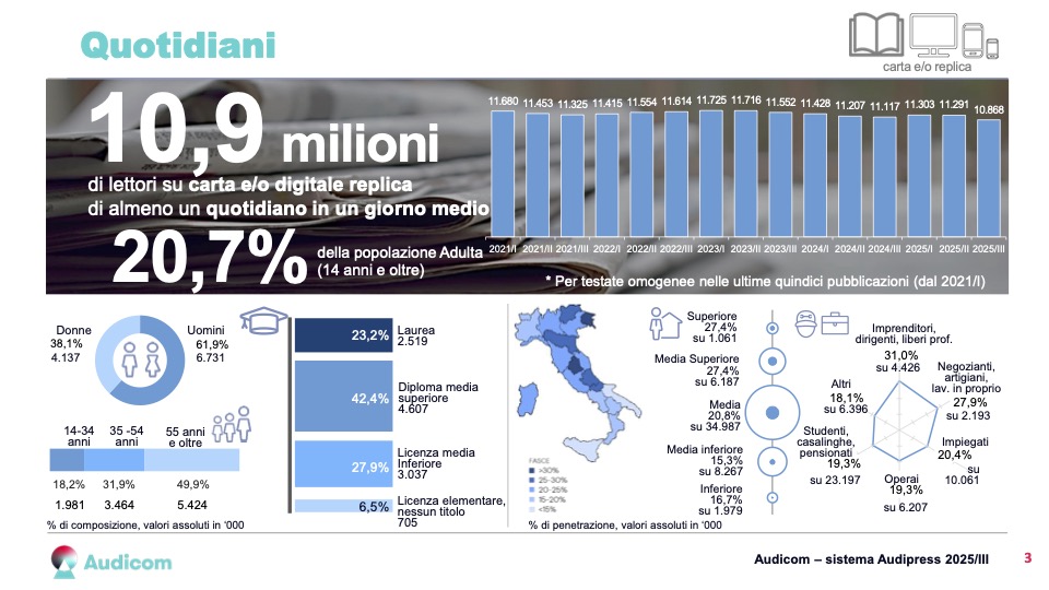 Audicom sistema Audipress ha pubblicato i dati relativi all’anno mobile febbraio-dicembre 2025, nel quale 30,2 milioni di italiani (il 57,6% della popolazione sopra i 14 anni) hanno letto o sfogliato un titolo stampa, cartaceo o digitale replica.
