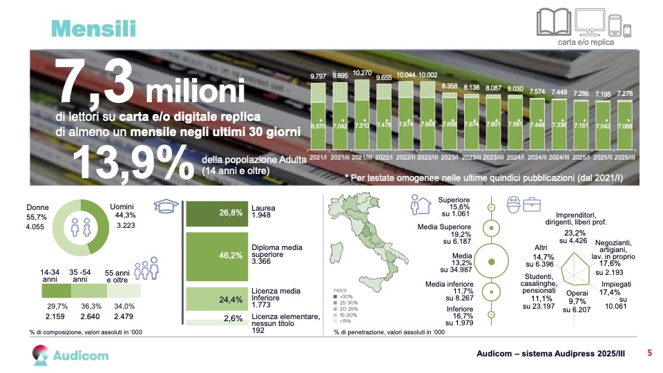 Formato, quest’ultimo, che raggiunge gli 8,1 milioni di individui, segnando un balzo del 6,9% rispetto allo stesso periodo del 2024. Quello che era iniziato come un ripiego tecnologico post-lockdown è oggi un prodotto editoriale solido, capace di attrarre sia i lettori storici che nuove fasce di pubblico grazie alla qualità dell’esperienza digitale.