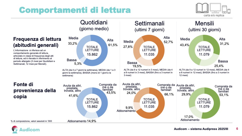 Analizzando le abitudini di consumo, rispetto alla rilevazione precedente emerge che le letture dei quotidiani provenienti da abbonamento sono cresciute del 9,7% nel giorno medio. Anche i periodici mostrano segnali positivi: i mensili segnano un +7,6% da abbonamento e un incremento del 6,7% nella frequenza di lettura “media”, indicando una base di lettori sempre più fedele.