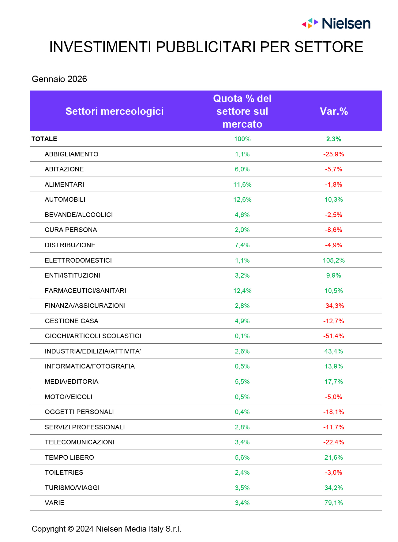 Segno positivo per la maggior parte dei mezzi. Tra i settori in evidenza Farmaceutici/Sanitari (+10,5%), Automobili (+10,3%) e Tempo libero (+21,6%