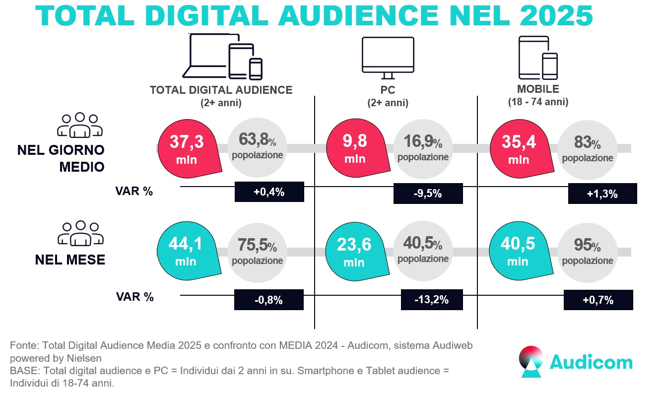 I dati di consumo dell’online nel 2025, prodotti dal sistema Audiweb e distribuiti da Audicom, resentano un ulteriore consolidamento della fruizione da Mobile (Smartphone e/o Tablet da parte della popolazione di 18-74 anni), con 35,4 milioni (media aritmetica dell’audience online nel giorno medio dei 12 mesi dell’anno) di utenti unici che hanno navigato nel giorno medio dei 12 mesi dell’anno (+1,3% rispetto alla media del 2024), mentre la fruizione da Computer ha registrato dati in flessione nella frequenza di accesso, con 9,8 milioni individui dai 2 anni in su (-9,5%) nello stesso periodo di analisi.