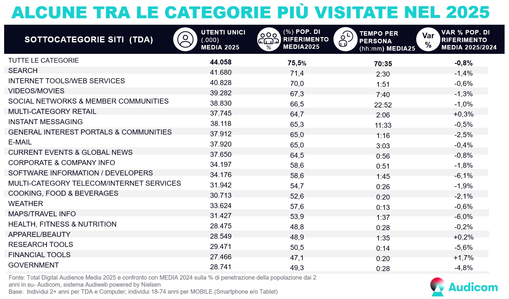 Dalla media dei dati dei 12 mesi di consumo dei siti e app mobile si registra una flessione complessiva pari a -0,8% distribuita tra i diversi raggruppamenti, ma risultano confermate le principali preferenze per gran parte della popolazione dai 2 anni in su.
