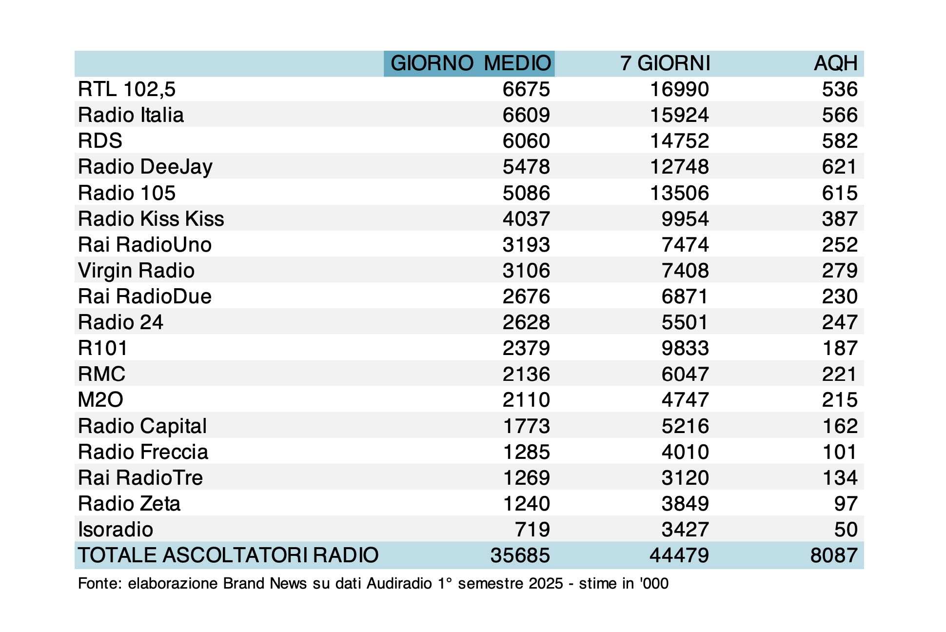 Audiradio ha pubblicato i dati della prima edizione dell’indagine sugli ascolti radiofonici, rilasciata con la benedizione di tutte le componenti del mercato che formano il nuovo JIC (Editori Radiofonici Associati (ERA), UNA – Aziende della Comunicazione Unite e UPA – Utenti Pubblicità Associati). I dati relativi al primo semestre 2025 (28/01-23/6) includono anche quelli di Rai Radio, che nel 2024 non aveva partecipato alla ricerca a causa di divergenze di ordine metodologico.