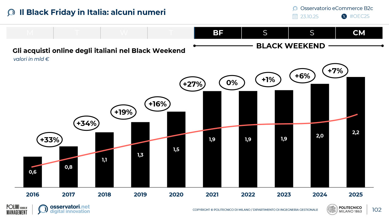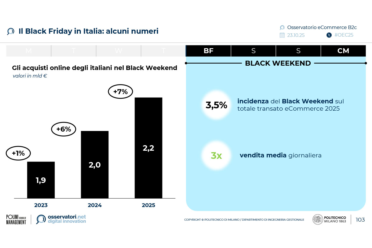 Quest’anno, nei giorni compresi tra il black friday e il cyber monday, gli italiani spenderanno online circa 2,2 miliardi di euro. Un dato in crescita del 7% rispetto al 2024. Gli operatori particolarmente competitivi realizzeranno anche 3 volte il fatturato di un giorno medio. Le stime sono dell’Osservatorio eCommerce B2c Netcomm – School of Management del Politecnico di Milano.