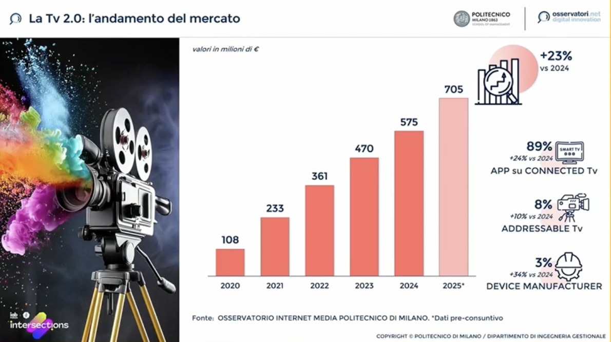 Tra gli highlight, Lamperti ha citato la CTV, la cui raccolta è arrivata a 705 milioni di euro crescendo del 23% rispetto al 2024, e il retail media dal valore di 640 milioni (+27%), con le piattaforme ecommerce internazionali che costituiscono l’80% del mercato e i retailer tradizionali il restante 20%.