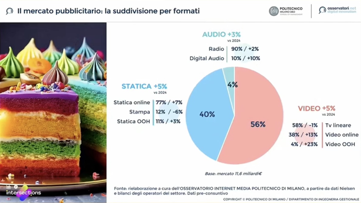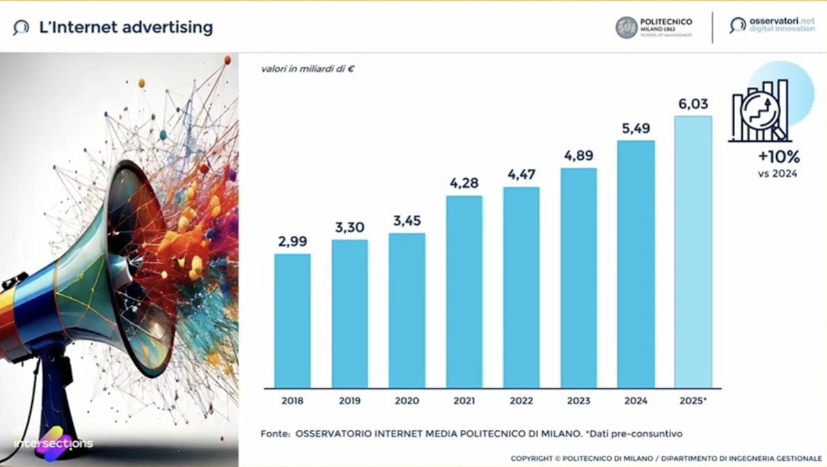 Il mercato dell’internet advertising, all’interno di un mercato pubblicitario totale di 11,6 miliardi di euro (+5%), arriverà quest’anno a 6,03 miliardi e crescerà del 10% rispetto al 2024, secondo l’Osservatorio Internet Media del Politecnico di Milano. Quella crescita pari a mezzo miliardo va però a totale beneficio delle grandi piattaforme, la cui quota di mercato si è ulteriormente ampliata di 2 punti percentuali raggiungendo l’84%. Come spiega Andrea Lamperti, senior advisor dell’Osservatorio Internet Media, “la crescita del mercato italiano corrisponde alla crescita dei grandi player internazionali, un fenomeno che abbiamo già raccontato su questo palco e che oggi emerge ancora più evidente”.