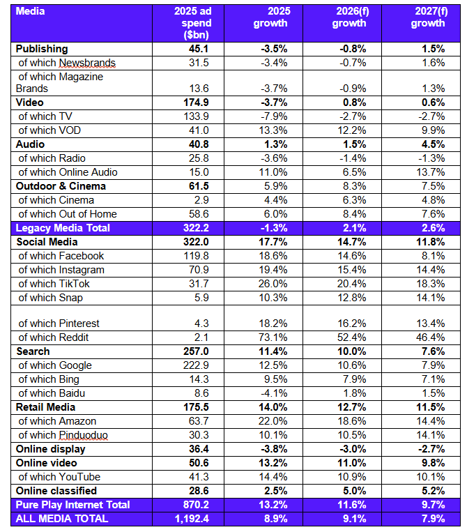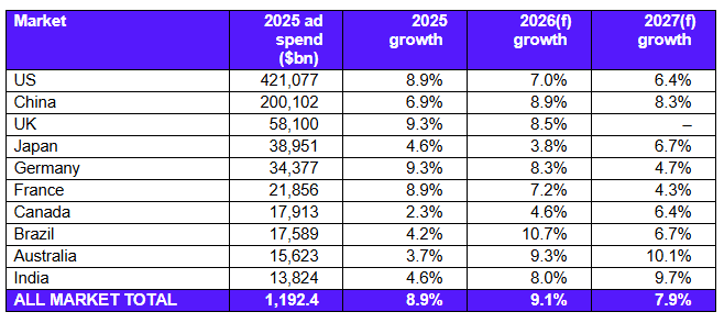 Per quanto riguarda il prossimo anno, le stime di Warc proiettano la crescita globale al 9,1% (1 pp in più rispetto alle previsioni di settembre) per complessivi 1.300 miliardi di dollari, sulla spinta di eventi come i Mondiali di Calcio in Canada, Messico e Usa e le elezioni di Midterm in Usa, mentre nel 2027 la crescita prevista è del 7,9% (+0,8 pp) e porta il mercato degli investimenti pubblicitari globali a 1.400 miliardi di dollari, praticamente il doppio rispetto al 2020 e l’equivalente di una spesa pro capite di 150 dollari.