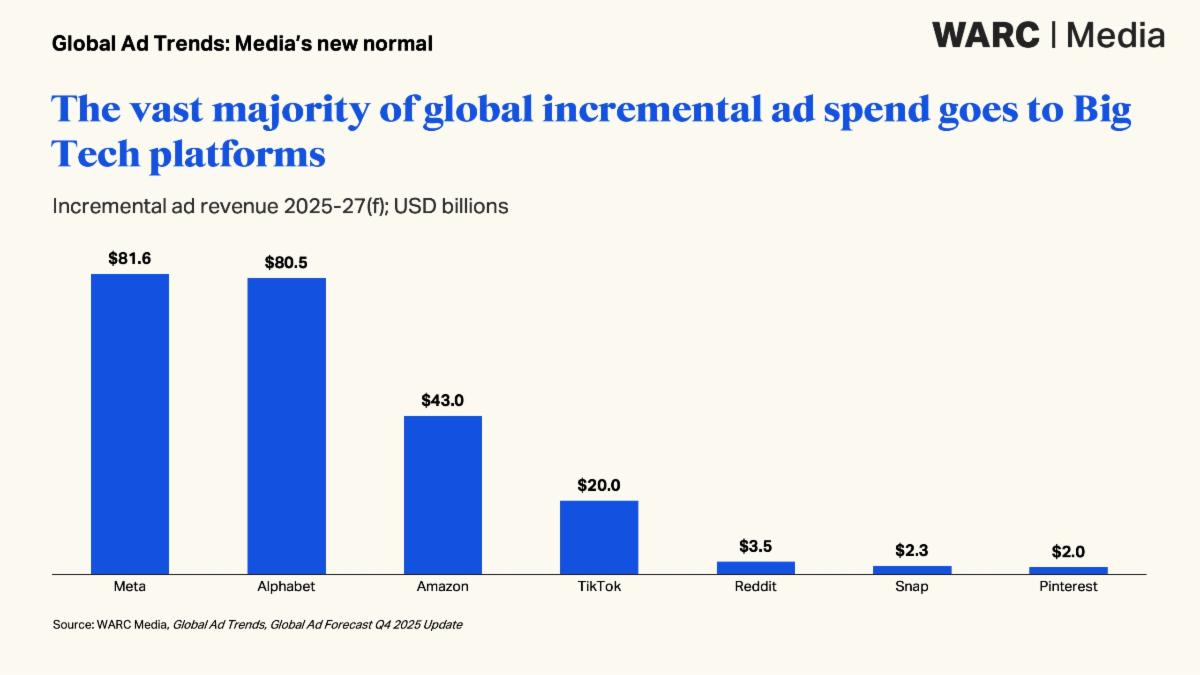 Warc, la società di marketing intelligence che fa capo a Informa, ha alzato le stime sull’andamento degli investimenti pubblicitari nel 2025, prevedendo un incremento dell’8,9% per complessivi 1.190 miliardi di dollari. Si tratta di 1,5 pp in più rispetto al forecast di settembre, ma la distribuzione degli investimenti non cambia e premia soprattutto le piattaforme delle Big Tech. Alphabet, Amazon e Meta insieme nel 2025 hanno conquistato il 56,1% del mercato – esclusa la Cina – e nel 2026 saliranno ulteriormente al 58%.