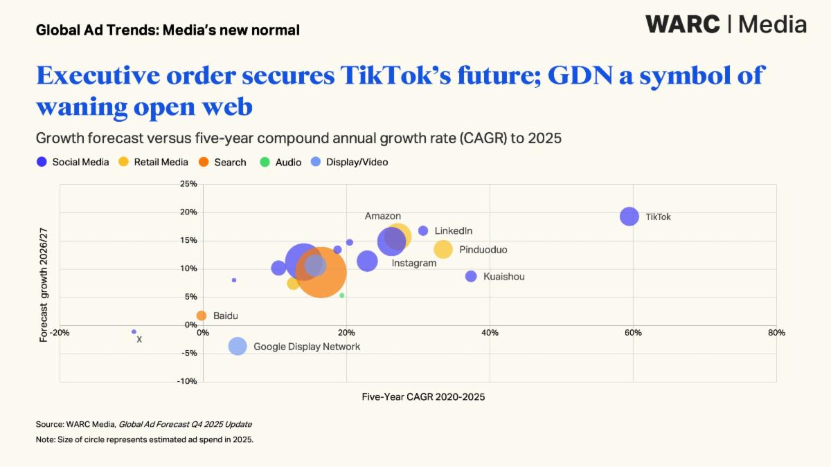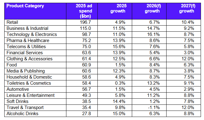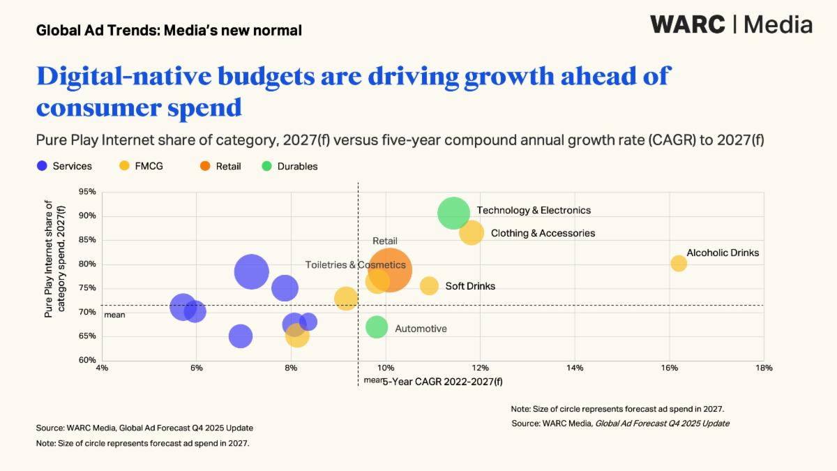 “Gli investimenti pubblicitari si sono staccati dal ciclo economico e si comportano in un modo che non riflette l’economia reale”, commenta Alex Brownsell, Head of Content di Warc Media. I nuovi capitali arrivano da categorie nativamente digitali, aggiunge, mentre il commerce “ha ridisegnato la mappa dei media misurati e il volano auto-alimentato delle Big Tech sta raccogliendo quasi tutti i dollari incrementali”.