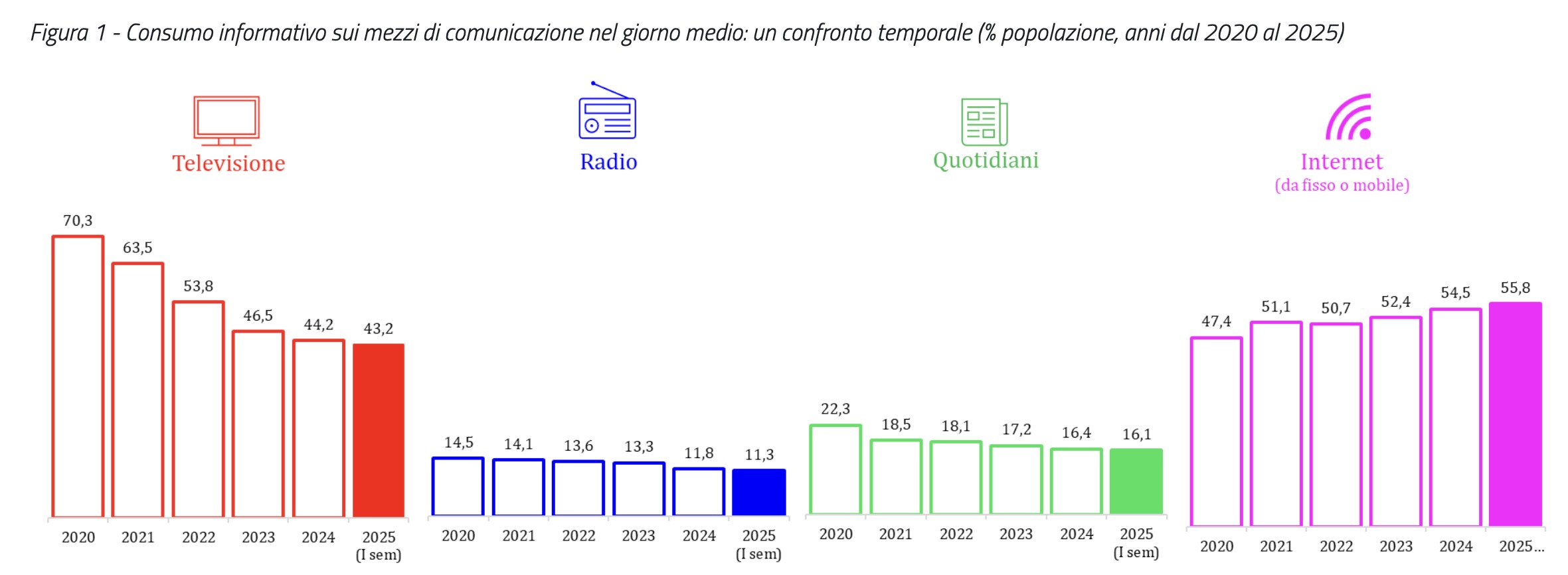 Il dato – risalente al primo semestre 2025 – emerge dalla seconda edizione dell’Osservatorio annuale sul sistema dell’informazione, realizzato dall’Autorità per le garanzie nelle comunicazioni (Agcom), secondo cui il consumo di informazione è sempre più polarizzato tra le generazioni: il 40,7% dei giovani tra i 14 e i 24 anni si informa esclusivamente online, mentre tra gli over 65 la televisione resta il punto di riferimento principale (59,8%), anche se l’utilizzo degli strumenti digitali cresce molto velocemente. Il 34,1% della popolazione tende a informarsi utilizzando un solo mezzo, ma cresce la fascia di chi utilizza almeno quattro mezzi diversi (26%) mentre quasi il 10% ne impiega sei o più (+4,3 punti percentuali rispetto al 2024).
