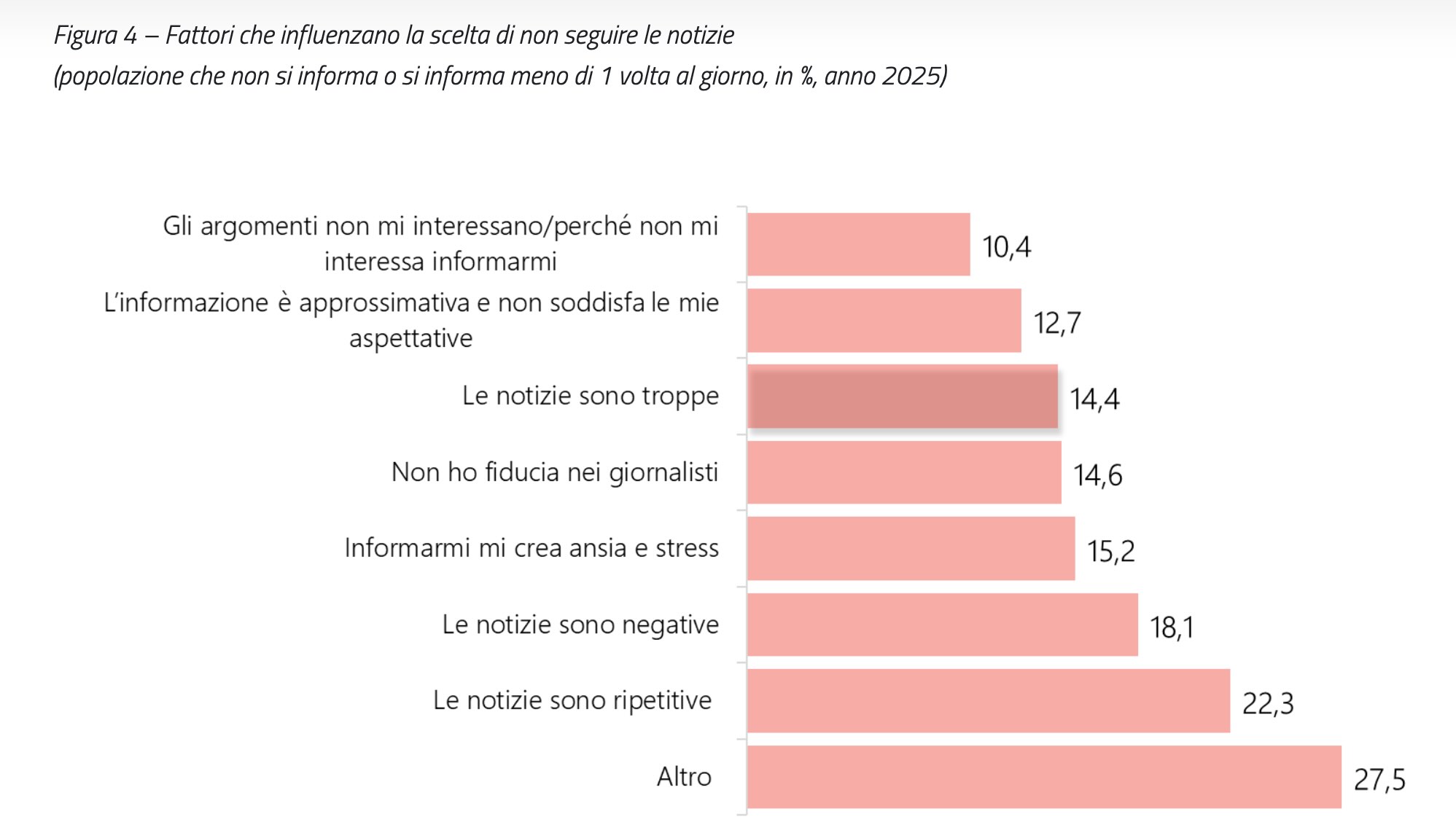 Il 22,3% cita la ripetitività dei contenuti (22,3%), la loro negatività (18,1%), l’impatto emotivo (15,2%), la sfiducia nei giornalisti (14,6%) e l’eccesso di informazioni (14,4%). Non aiuta anche la trasformazione dell’offerta informativa in tv, dato che nel 2025 la televisione generalista ha ridotto le ore dedicate ai programmi di approfondimento rispetto al 2024 (-11,3% delle ore nei programmi extra tg).