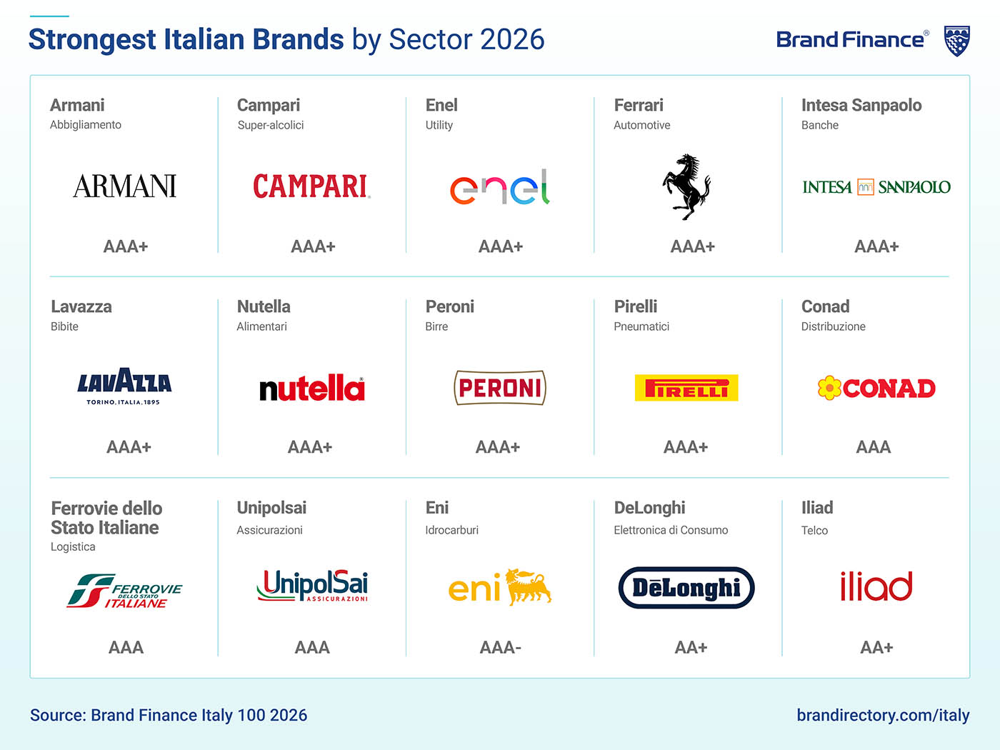 Il Brand Strength Index 2026 — la misura della capacità dei brand di influenzare le scelte dei consumatori italiani — restituisce un quadro complessivamente solido. Nove settori chiave su quindici esprimono un leader con il rating massimo AAA+: Armani nell’abbigliamento, Intesa Sanpaolo nelle banche, Ferrari nell’automotive, Nutella negli alimentari, Enel nelle utility, Lavazza negli analcolici, Campari nei super-alcolici, Pirelli negli pneumatici, Peroni nelle birre.