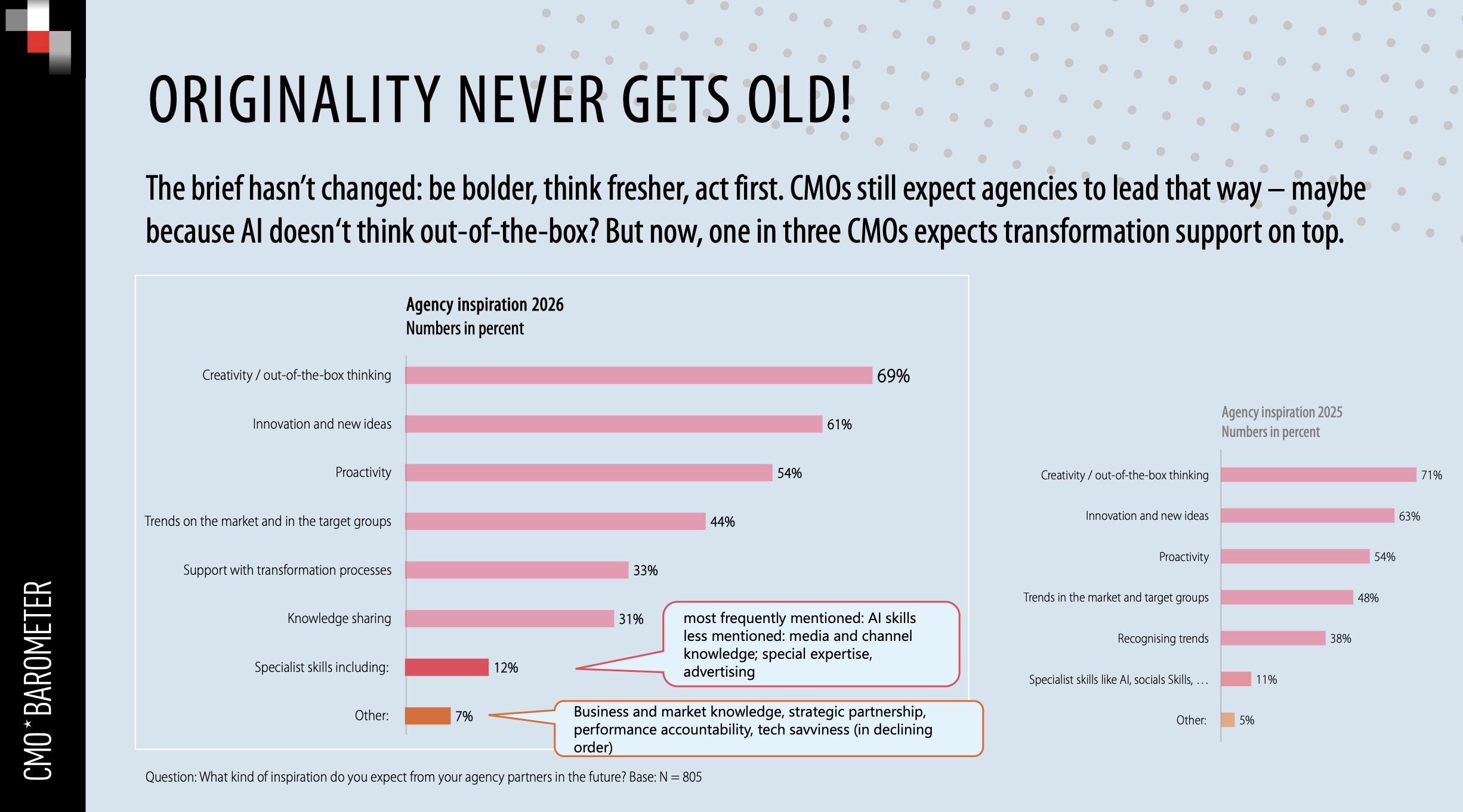 Alla domanda su cosa si aspettano dai partner d’agenzia nel 2026, i CMO continuano a mettere al primo posto creatività e pensiero creativo (69%), seguiti da innovazione (61%) e proattività (54%). Ma per la prima volta, il supporto nella gestione della trasformazione interna entra nella lista (44%).