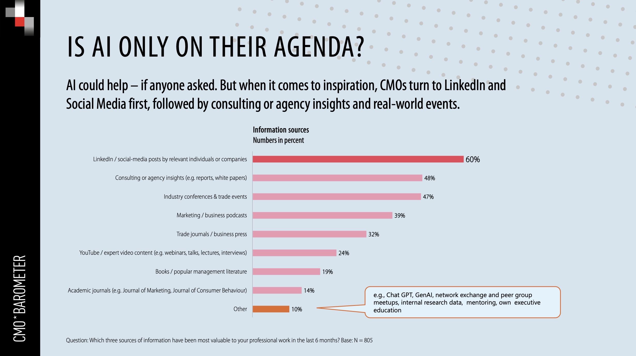 Alla domanda su dove acquisiscono conoscenze di settore, la maggior parte dei CMO cita LinkedIn e post social di thought leader e aziende rilevanti (60%), seguiti da contenuti di consulenti e agenzie (48%) e conferenze/eventi di settore (47%).