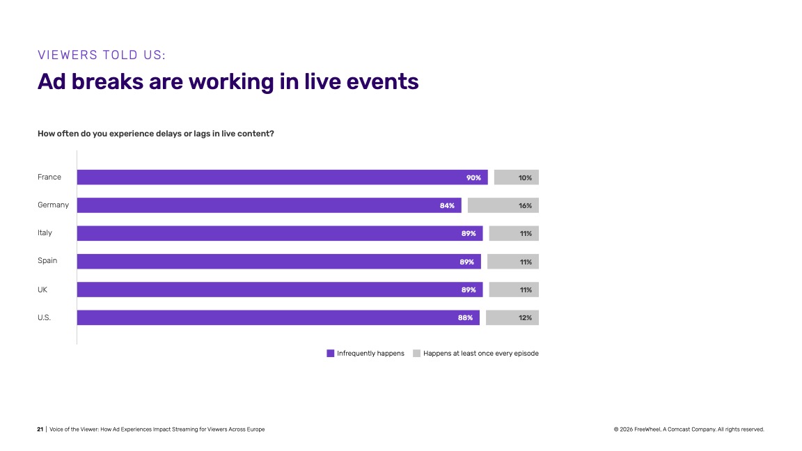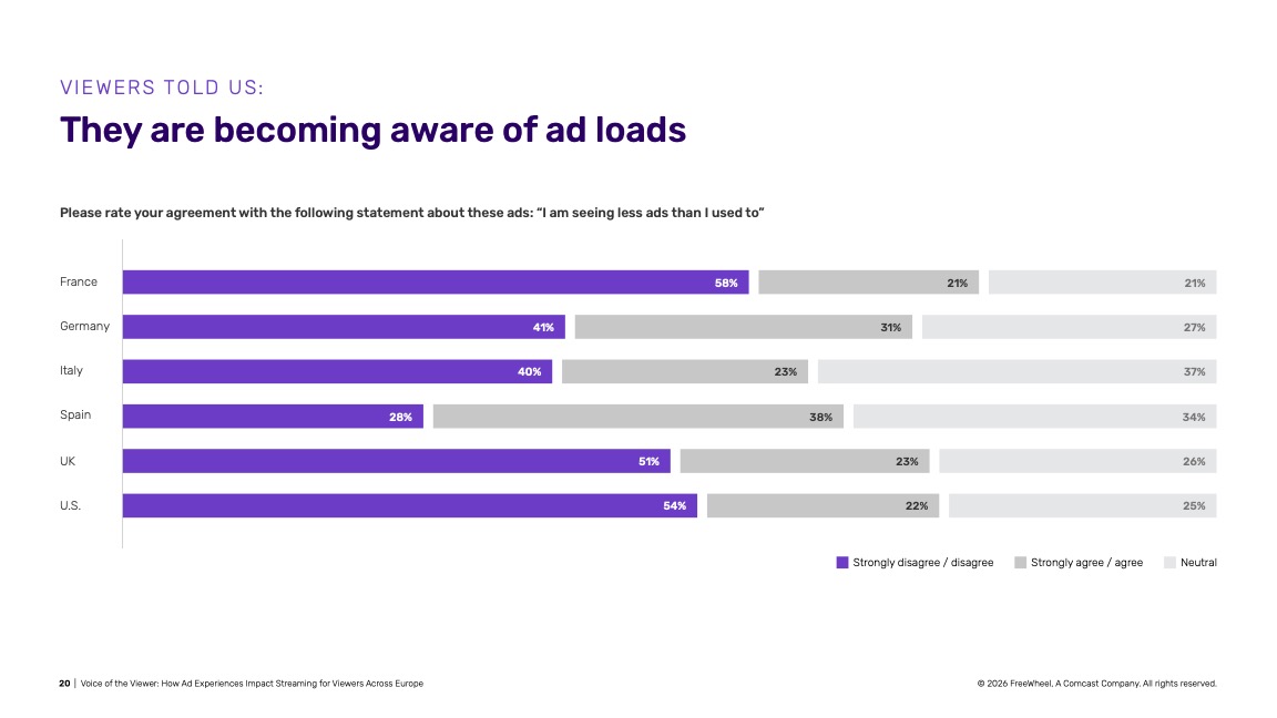 Secondo il nuovo report di Freewheel ‘Voice of the Viewer’, l’85% degli spettatori europei utilizza piani di streaming che includono pubblicità, e però la ripetizione e l’irrilevanza degli annunci a cui vengono esposti compromette l’esperienza di visione.