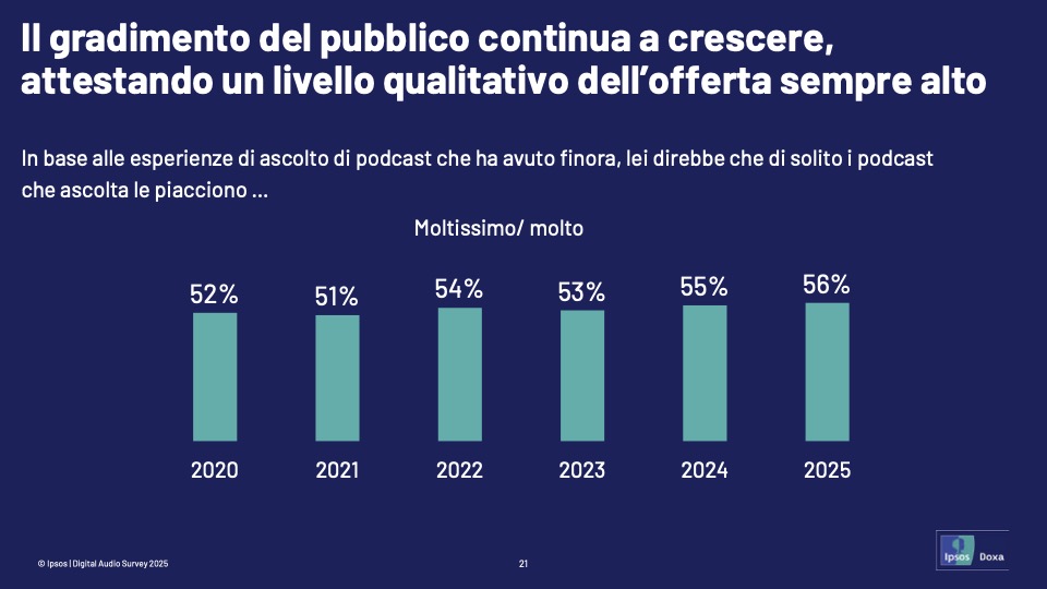 Quality time. In una giornata tipo, ai podcast vengono dedicati 40 minuti, tanto quanto nel 2024. Insieme alle modalità di ascolto – smartphone e casa – il tempo dedicato è di qualità e la relazione si è rafforzata nel tempo: per il 74% l’opinione nei confronti dei podcast è migliorata, il 44% dichiara di ascoltarne di più, contro il 22% che dice di ascoltarne meno. Il mezzo, sottolinea la ricerca, è ‘anti-zapping’, con il 62% ascolta il podcast per l’intera durata e la serialità è diventata una leva cruciale per la fidelizzazione, con un gradimento generale dei podcast ascoltati che arriva al 56%.