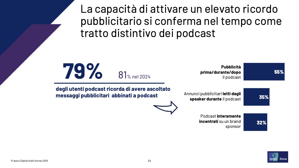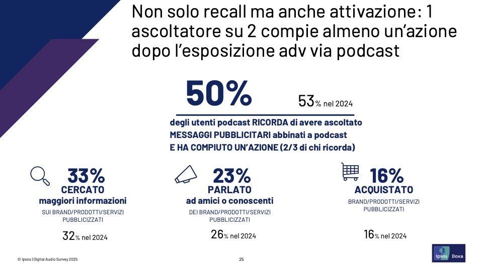 Ricordo pubblicitario. L’efficacia dei podcast come veicolo pubblicitario è un tratto unico che perdura nel tempo: il 79% degli ascoltatori ricorda pubblicità associate ai podcast e il 50% (2/3 di chi ricorda) ha compiuto un’azione dopo l’esposizione a comunicazioni pubblicitarie, soprattutto ricerca di informazioni (33%), seguita da passaparola (23%) e acquisto (16%). Un mezzo “capace di offrire ai brand un modo efficiente ed efficace per costruire narrazioni e stabilire connessioni profonde”, commenta Claudia D’Ippolito, Senior Researcher in Media Development, sottolineando l’importanza per realizzatori e produttori di podcast di “capitalizzare il valore dell’attenzione e dell’engagement”.